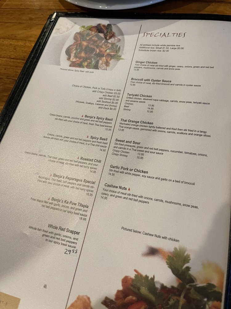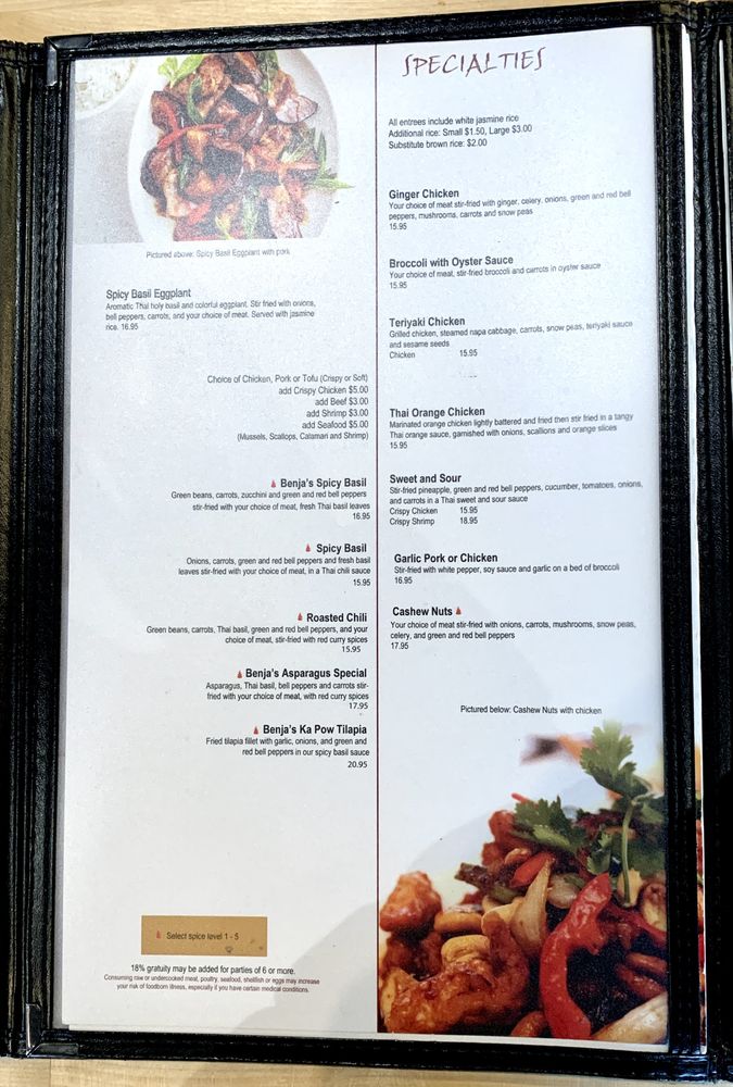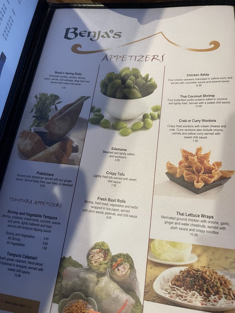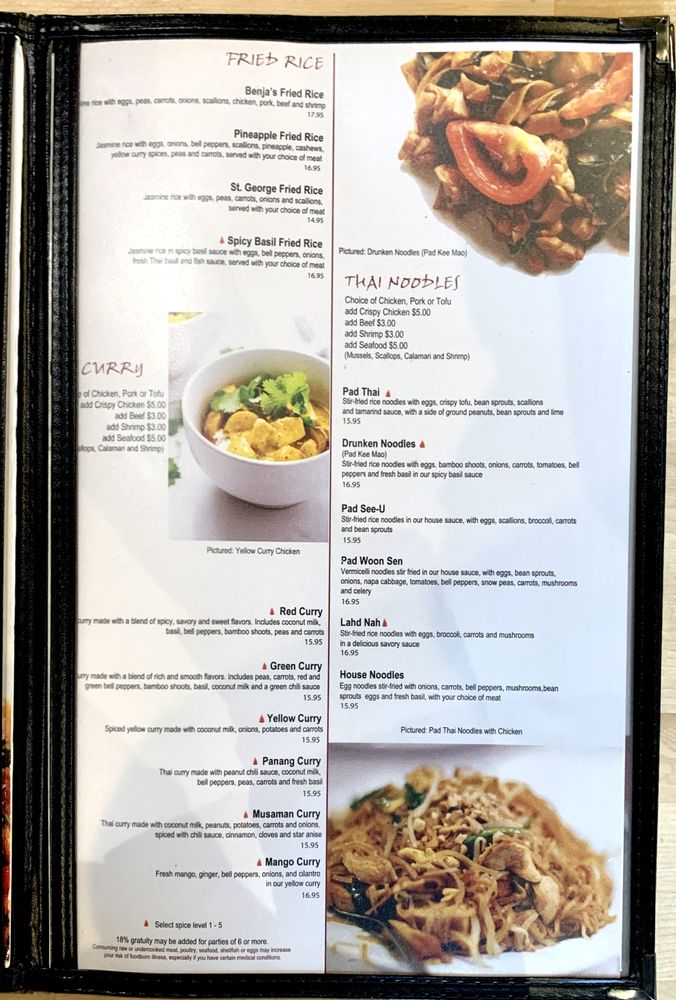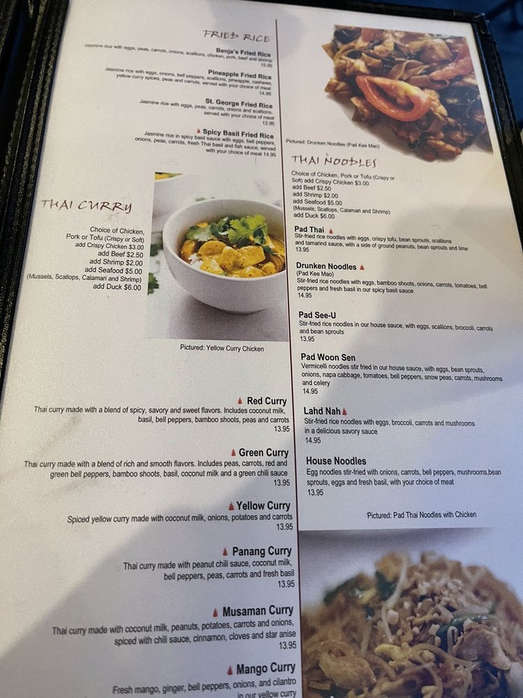 Benja’s Thai Garden in St. George, UT offers a classy yet casual dining experience with a variety of vegan and vegetarian options. From flavorful appetizers like Benja's Spring Rolls and Chicken Satay to exotic soups such as Tom Kha Kai and Chicken Tom Yum, the menu is diverse and delicious. The Yum Yai Salad and Papaya Salad are must-tries, showcasing the freshness and bold flavors of Thai cuisine. Customer reviews highlight the excellent service and the standout dishes like the Drunken Noodles and Mango Curry. Whether you're a Thai food enthusiast or looking to try something new, Benja’s Thai Garden is a top choice in Southern Utah.