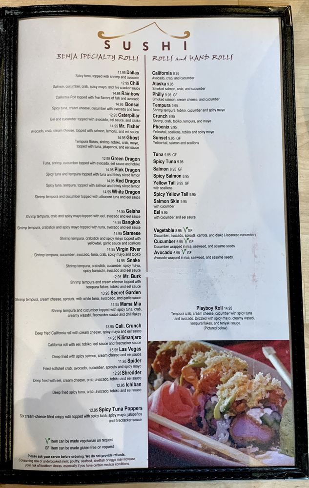 Tempura crab, cream cheese, cucumber, spicy tuna, avocado, drizzled with spicy mayo, creamy Wasabi, teriyaki sauce, and Tempura flakes